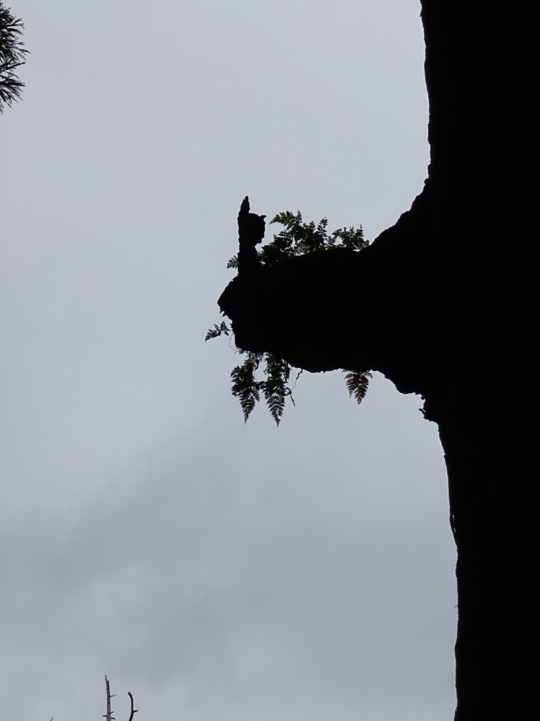 御神木を決まった場所から見上げると、参拝する人の様な形をした枝があります。