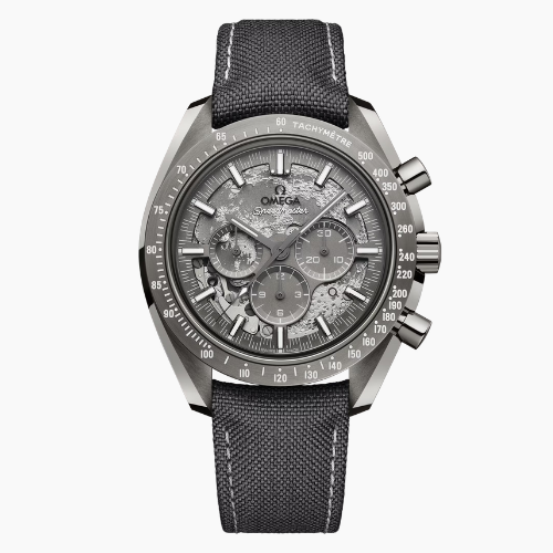 オメガの宇宙探査のレガシーを称える、「スピードマスター グレーサイド オブ ザ ムーン」プラズマ仕上げを施した、44.25mmのポリッシュ&ブラッシュ仕上げのグレーセラミック製ケースを備えています。ブラッシュ仕上げのベゼルも同じくグレーセラミック製で、ホワイトのスーパールミノヴァを塗布したレーザーエングレービングのタキメータースケールが付いています。