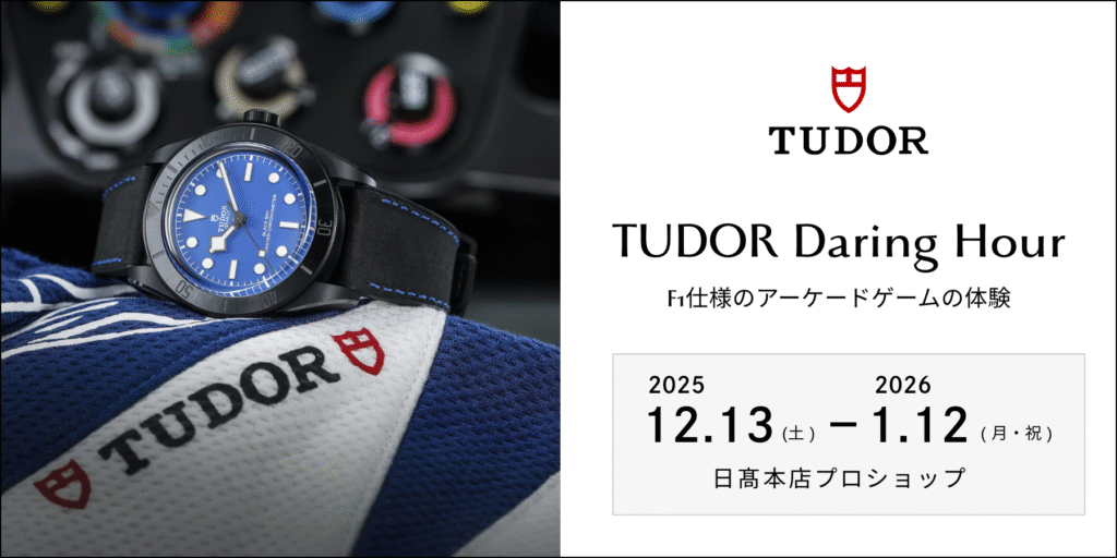 2025年12月13日(土)から、2026年1月12日(月・祝)まで、日髙本店プロショップにて『TUDOR Daring Hour』を開催いたします。チューダーのコンセプトスペースが登場し、F1仕様のアーケードゲームの体験をお楽しみいただけます。また、店内では多彩なタイムピースも展示中です。皆さまのご来店を心よりお待ちしております。