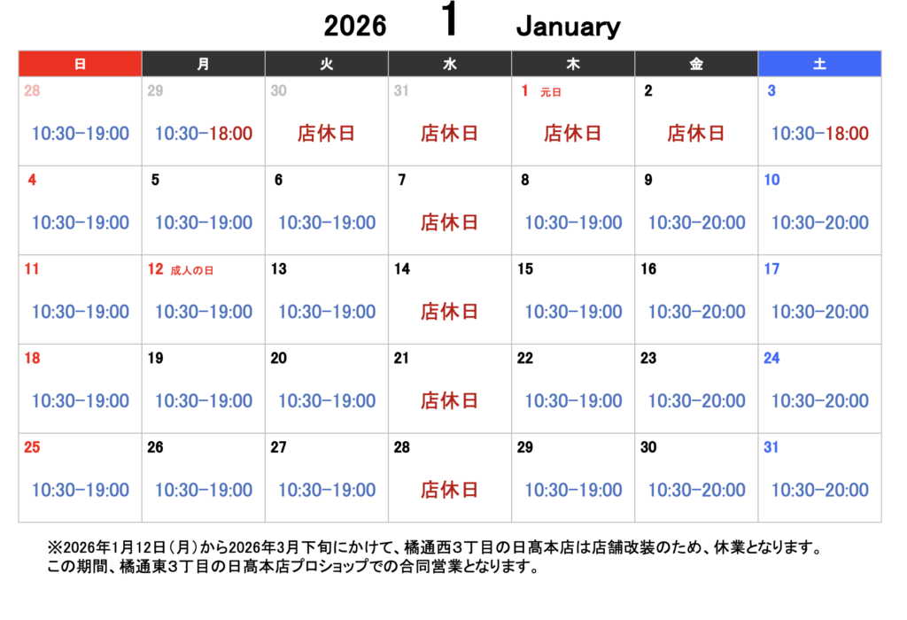 【2026年1月営業スケジュール】日髙本店・日髙本店プロショップ両店とも毎週水曜日は定休日となります。※2026年1月12日(月祝)~3月下旬:店舗改装のため、日髙本店は休業。この期間、日髙本店プロショップでの合同営業となります。