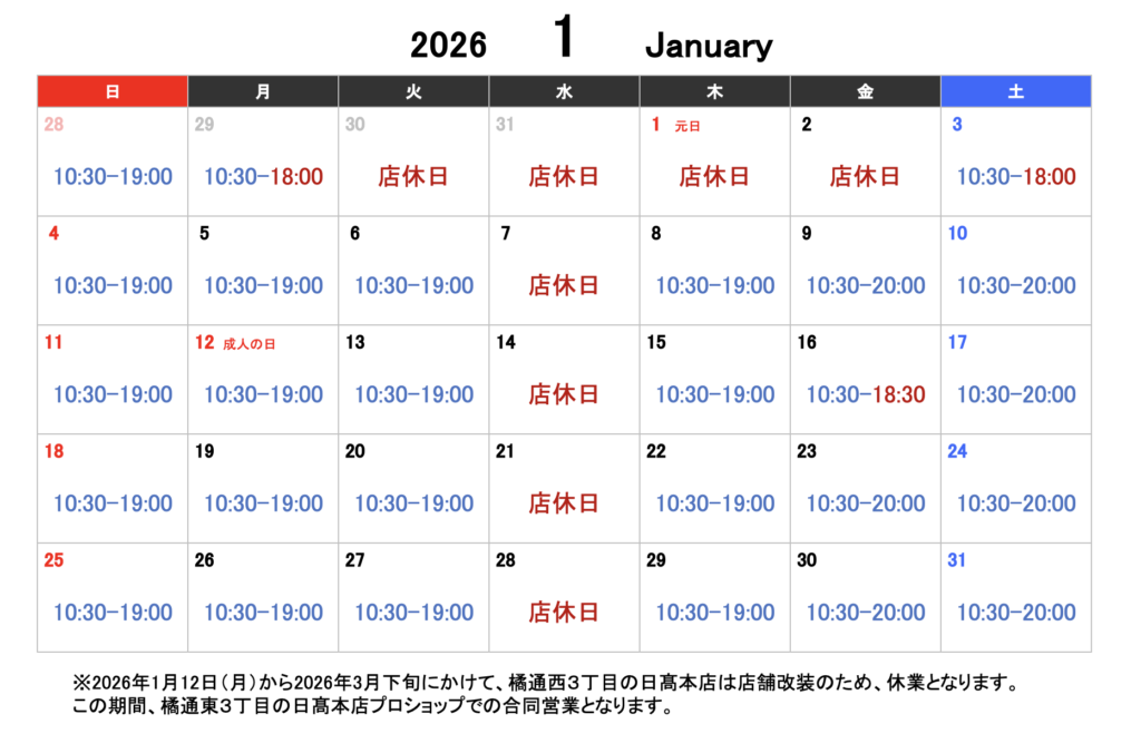 【2026年1月営業スケジュール】日髙本店・日髙本店プロショップ両店とも毎週水曜日は定休日となります。※2026年1月12日(月祝)~3月下旬:店舗改装のため、日髙本店は休業。この期間、日髙本店プロショップでの合同営業となります。
