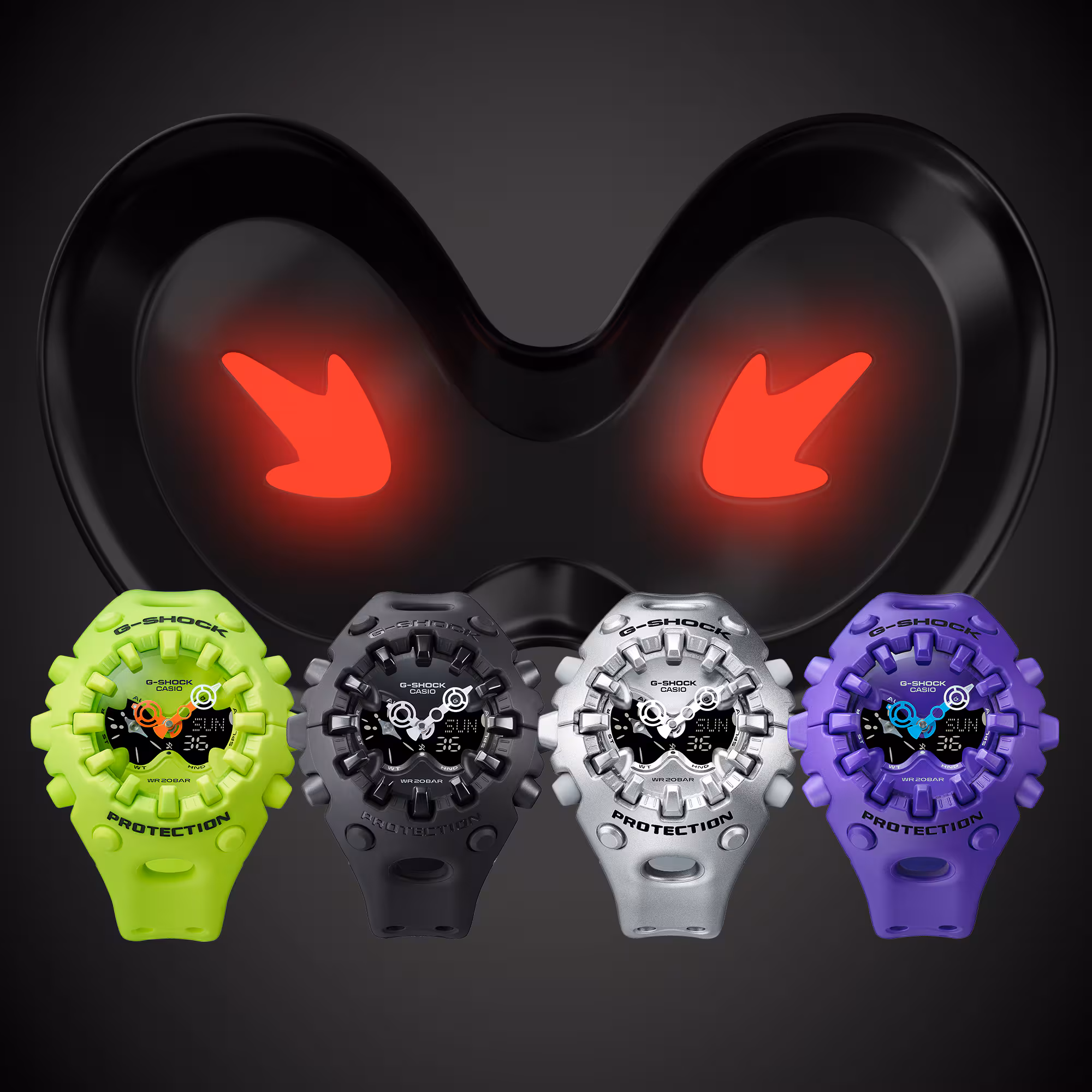 エッジの効いたパーツを組み合わせた有機的な外装フォルム、2つの穴が大きな特徴となっているショックリリース針など常識を覆す斬新な発想で、強さを求めて挑戦を続けるG-SHOCKのアイデンティティを形にしました。