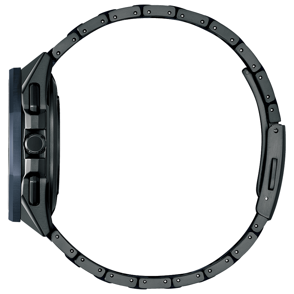 ベゼルとバンドの中駒にDLCブルーを採用。ラメを練り込んだブラックの文字板は、漆黒の静かな宇宙空間に浮かぶ星々を表現しました。ブラックとダークブルーの組み合わせが大人の落ち着きと特別感を演出します。