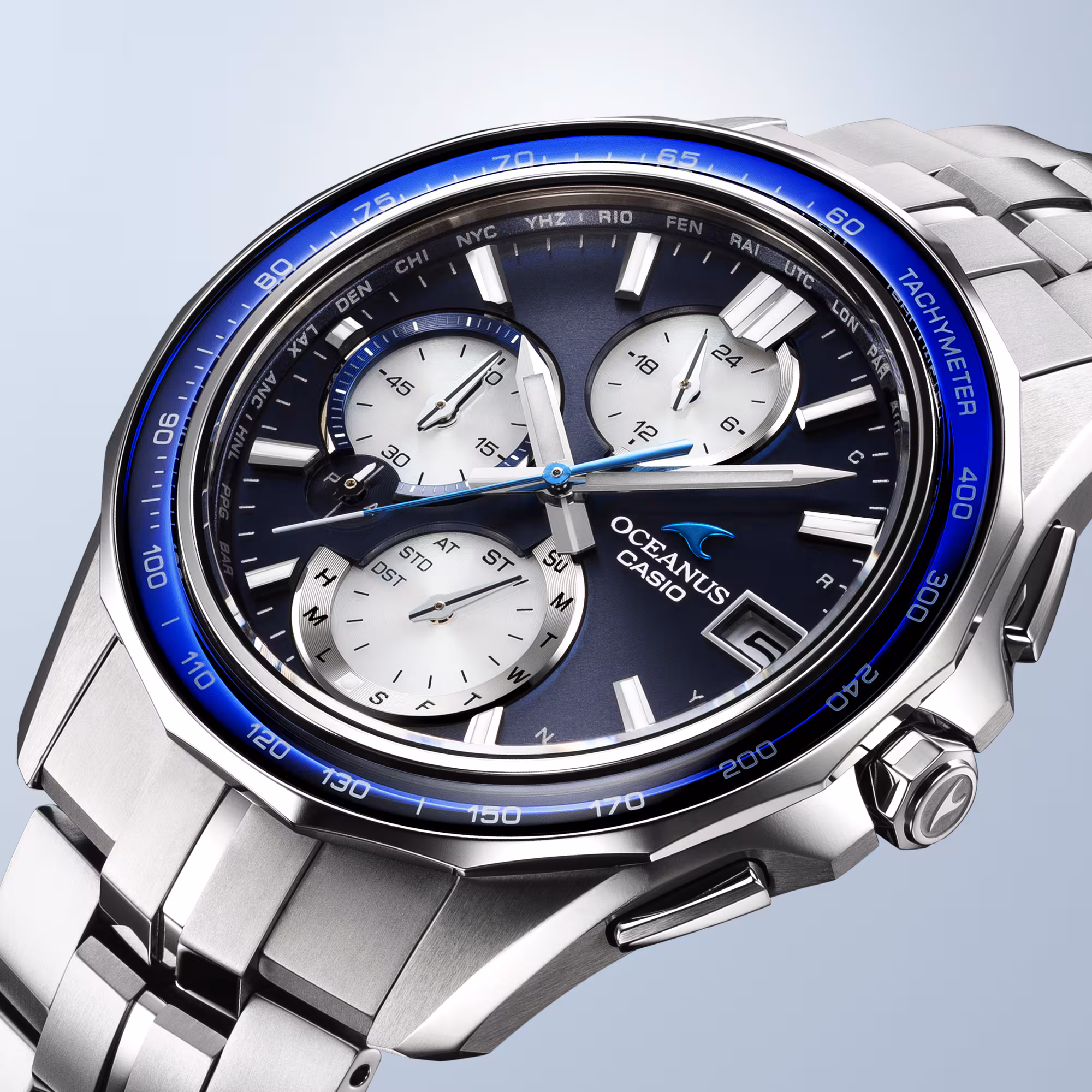 また、メインダイアルとベゼル上のサファイアには、トーンを合わせたブルー蒸着を採用し、ブルーとホワイトのバイカラーでOCEANUSらしい爽やかなモデルに仕上がっています。