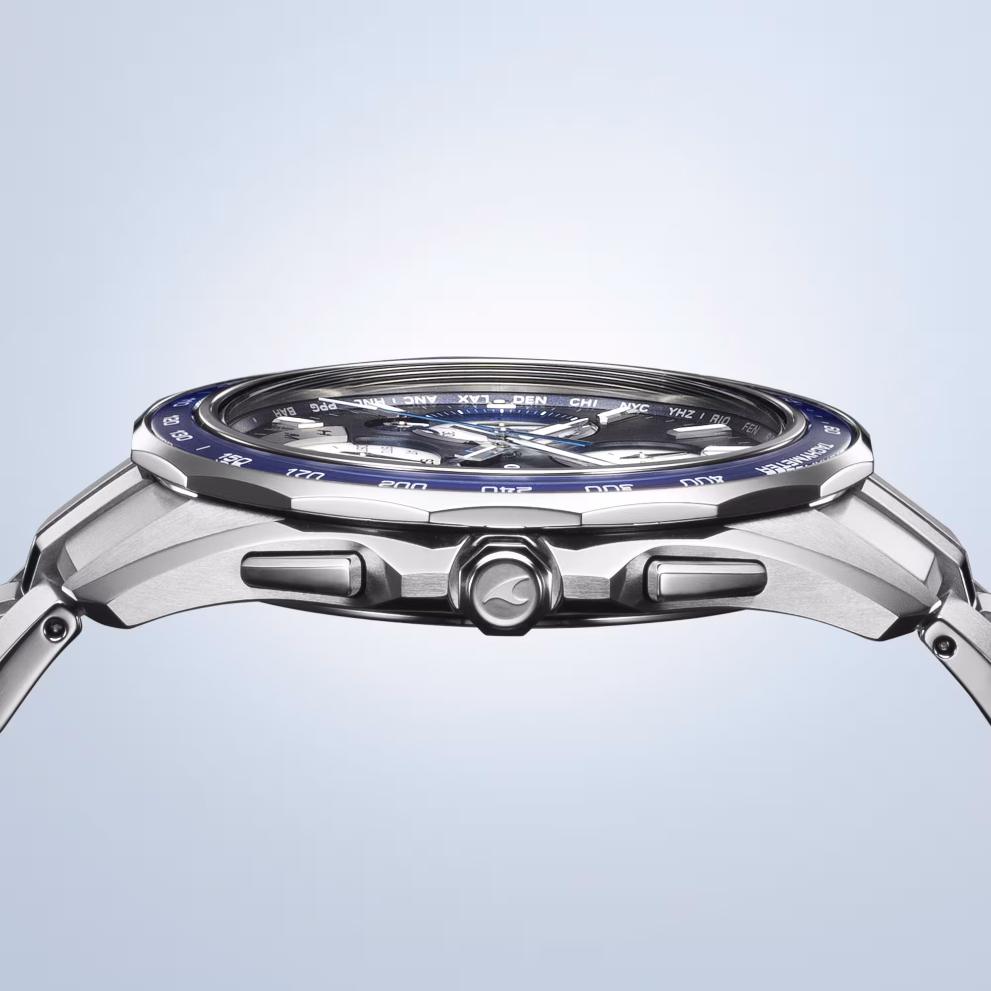 海を感じられるブルーと美しい輝きを放つ上質なホワイトのインダイアルを採用した爽やかなカラーリングが特徴です。インダイアルは不透過のホワイト蒸着により、高発色で輝度の高いホワイトに仕上がっています。