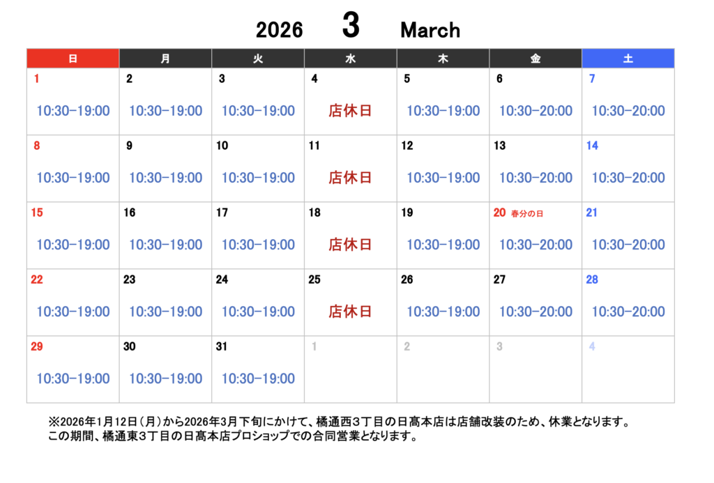 【2026年3月営業スケジュール】日髙本店・日髙本店プロショップ両店とも毎週水曜日は定休日となります。※2026年1月12日(月祝)~3月下旬:店舗改装のため、日髙本店は休業。この期間、日髙本店プロショップでの合同営業となります。
